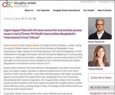 ডাউটি স্ট্রিট চেম্বার্স সোমবার এক বিবৃতিতে জানায়—শেখ হাসিনার অনুপস্থিতিতে বিচার পরিচালনা, আত্মপক্ষ সমর্থনের সুযোগ না দেওয়া, এবং আইনজীবীদের ওপর হামলা–নির্যাতনের অভিযোগের কারণে এই জরুরি হস্তক্ষেপ চাওয়া হয়েছে।
