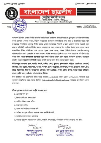 বাংলাদেশ ছাত্রলীগের কেন্দ্রীয় সভাপতি সাদ্দাম হোসেন ও সাধারণ সম্পাদক শেখ ওয়ালী আসিফ ইনান স্বাক্ষরিত ওই বিজ্ঞপ্তিটি প্রকাশ করা হয় ৯ জানুয়ারি ২০২৬ তারিখে।