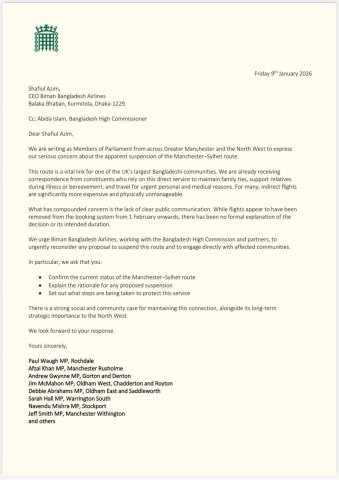 এই পরিস্থিতিতে গ্রেটার ম্যানচেস্টার ও উত্তর পশ্চিম ইংল্যান্ডের একাধিক সংসদ সদস্য আনুষ্ঠানিকভাবে উদ্বেগ জানিয়ে বিমান বাংলাদেশের প্রধান নির্বাহী কর্মকর্তাকে চিঠি দিয়েছেন। চিঠিতে স্বাক্ষর করেছেন রচডেলের এমপি পল ওয়াহ, ম্যানচেস্টার রাশহোমের এমপি আফজাল খান, গর্টন ও ডেন্টনের এমপি অ্যান্ড্রু গুইন, ওল্ডহ্যাম ওয়েস্ট চ্যাডারটন ও রয়টনের এমপি জিম ম্যাকমাহন, ওল্ডহ্যাম ইস্ট ও স্যাডলওয়ার্থের এমপি ডেবি আব্রাহামস, ওয়ারিংটন সাউথের এমপি সারাহ হল, স্টকপোর্টের এমপি নবেন্দু মিশ্রা এবং ম্যানচেস্টার উইথিংটনের এমপি জেফ স্মিথসহ আরও অনেকে।