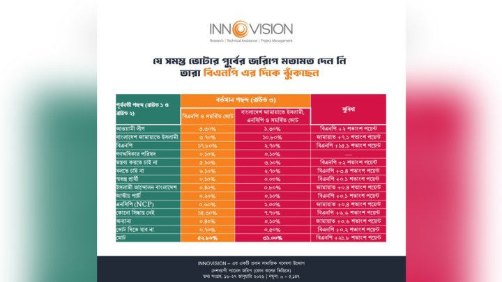 জরিপে আরও উঠে এসেছে, মোট নমুনার প্রায় ৩০ শতাংশ ভোটার এখনো তাদের ভোটের পছন্দ প্রকাশ করেননি। এই ভাসমান ভোটারদের সিদ্ধান্তের ওপরই চূড়ান্ত নির্বাচনি ফল অনেকাংশে নির্ভর করবে বলে মনে করছেন জরিপ সংশ্লিষ্টরা।