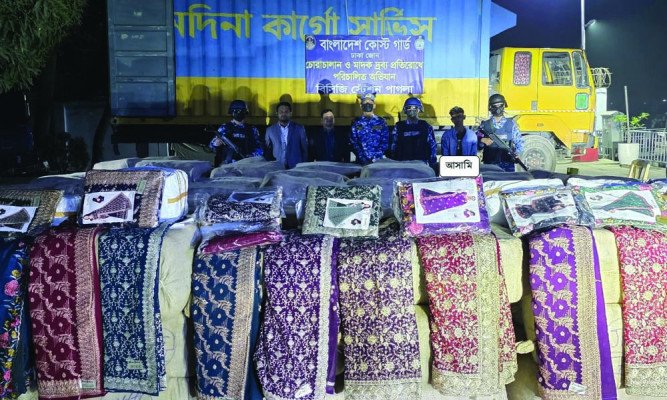 নারায়ণগঞ্জে শুল্ক ফাঁকি দিয়ে দেশে আনা বিপুল পরিমাণ ভারতীয় শাড়ি উদ্ধার করেছে বাংলাদেশ কোস্ট গার্ড। অভিযানে প্রায় ১০ কোটি টাকা মূল্যের শাড়িসহ একজন পাচারকারীকে আটক করা হয়েছে।