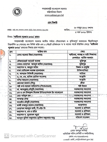 সরকারের ঘোষণায় বলা হয়েছে, স্বাধীনতা ও মুক্তিযুদ্ধ, বিজ্ঞান ও প্রযুক্তি, সাহিত্য, সংস্কৃতি, ক্রীড়া, চিকিৎসাবিদ্যা, সমাজসেবা, গবেষণা ও পরিবেশ সংরক্ষণসহ বিভিন্ন ক্ষেত্রে গুরুত্বপূর্ণ অবদান রাখায় এই সম্মাননা দেওয়া হচ্ছে।